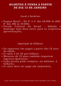 Este espetáculo vai ser apresentado no Auditório Municipal do Fórum Cultural do Seixal nos dias 18 de janeiro, às 21 horas, e 19 de janeiro, às 16 horas.